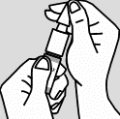 2) Agite o frasco e então remova a tampa protetora do aplicador. Segure o frasco na posição vertical com o dedo médio e o indicador sobre o aplicador e o polegar na base do frasco.