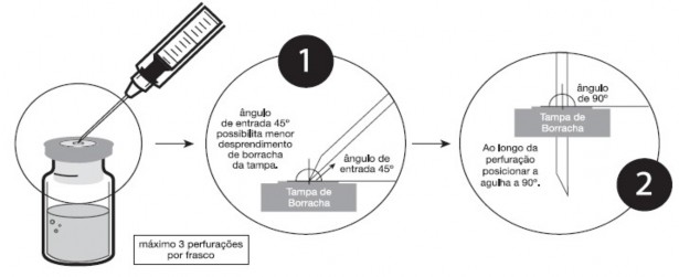 - Perfurar a tampa de borracha de Vinatin dentro do círculo central demarcado, inserindo assepticamente a agulha a 45º com bisel voltado para cima e, ao longo da perfuração, posicioná-la a 90º (figura abaixo);