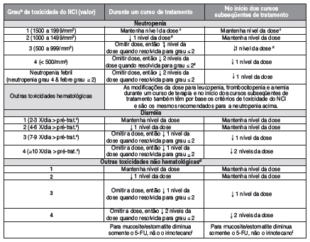a - As modificações da dose referem-se ao 5-FU e cloridrato de irinotecano; a dose de LV permanece fixa em 20 mg/m2 (não ajustada).
